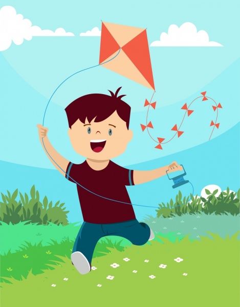 Childhood background joyful boy kite icons colored cartoon Free vector