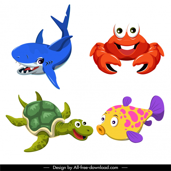 Sea animals icons cute cartoon sketch colorful design Free vector