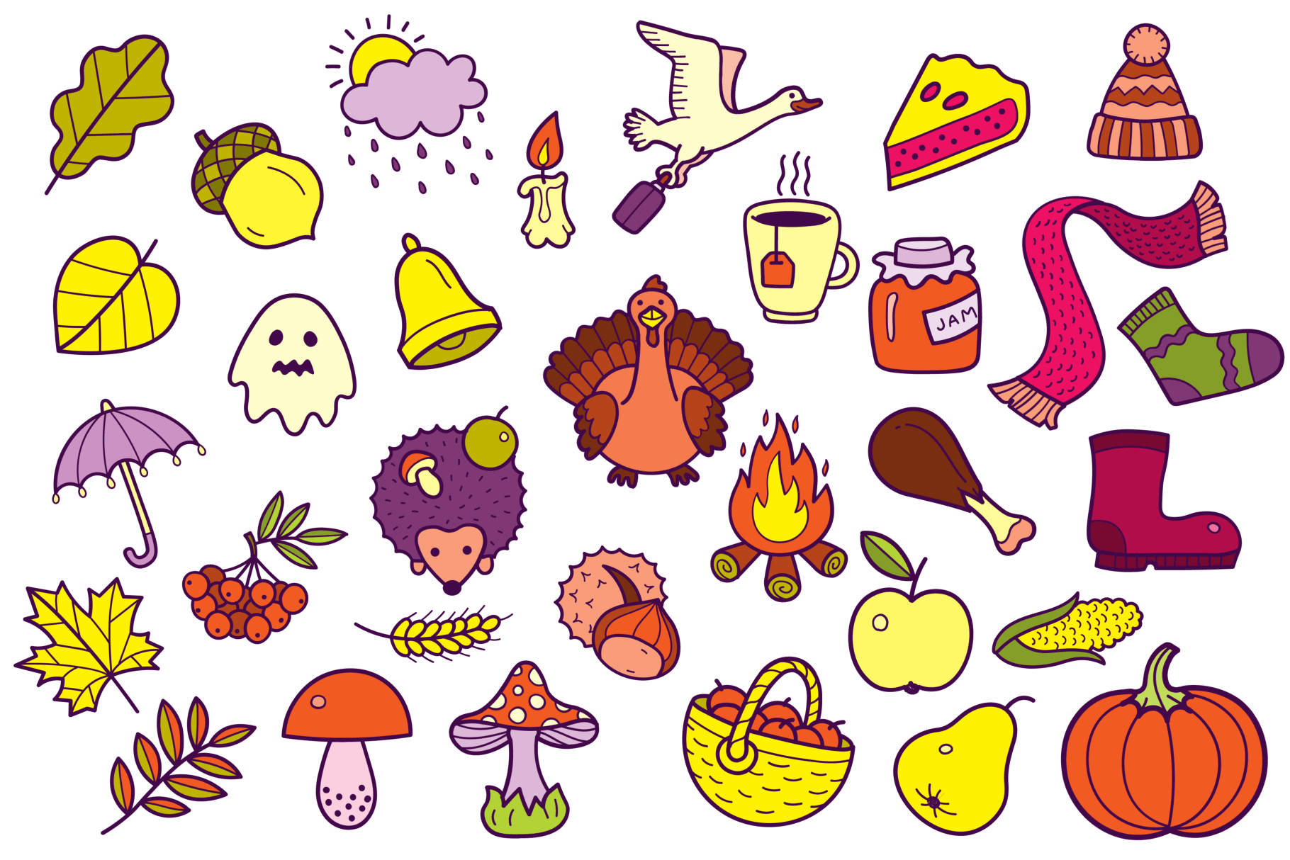 AUTUMN HAND DRAWN SEAMLESS PATTERN AND ICONS