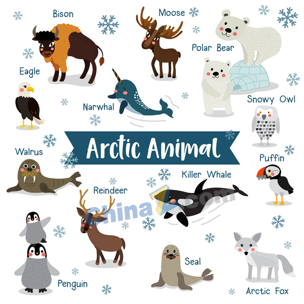 펭귄, 북극여우, 물개, 순록, 북극곰이 일러스트로 작업되어 있다.