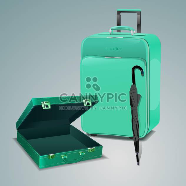 Vector Illustration Of Pile Of Luggage And Green Travel Bag With Umbrella. Free Vector