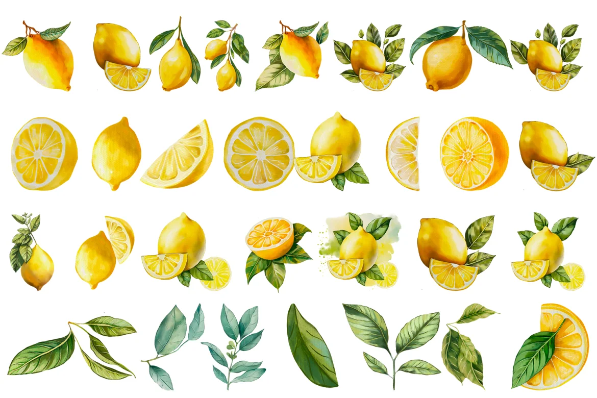 수채화 일러스트 스타일로 그린 레몬 일러스트 30개를 다운 받을 수 있다.