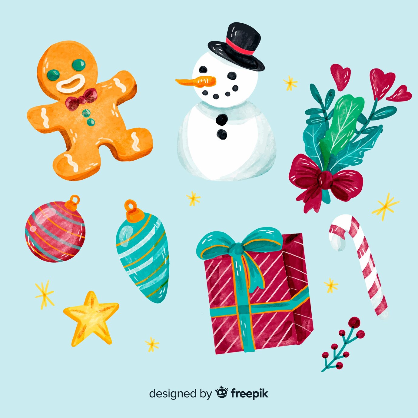크리스마스 디자인, 크리스마스 카드, 크리스마스 도안에 자주 쓰이는 이미지가 일러스트로 디자인되었다.
